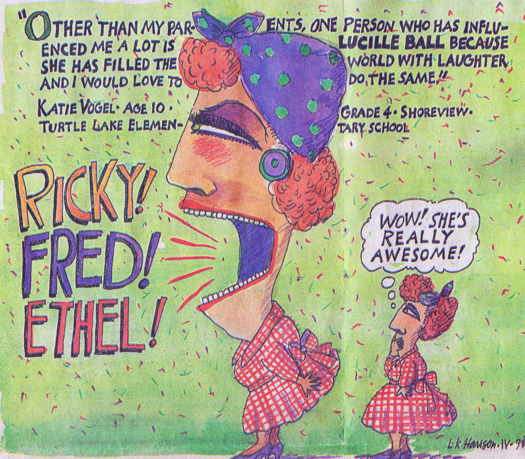 In the fourth grade, my teacher gave our class an assignment, which was to write a one-page essay about someone who has influenced our thinking or inspired us. I must have been feeling cheeky that day, because I chose to write only one sentence, as follows: “Other than my parents, one person who has influenced me a lot is Lucille Ball because she has filled the world with laughter and I would love to do the same.” My teacher sent all of our entries into a contest called “Mindworks,” a column in the variety section of the Minneapolis Star Tribune in which a thought-provoking question was posed each month and elementary school children were encouraged to submit entries. A cartoonist for the Star Tribune (L.K. Hanson, wherever you are, I hope you’re well) found my entry amusing enough to illustrate, and so – to my mother and father’s shock and parental glee – my words were published on the front page of the variety section the next Monday morning.